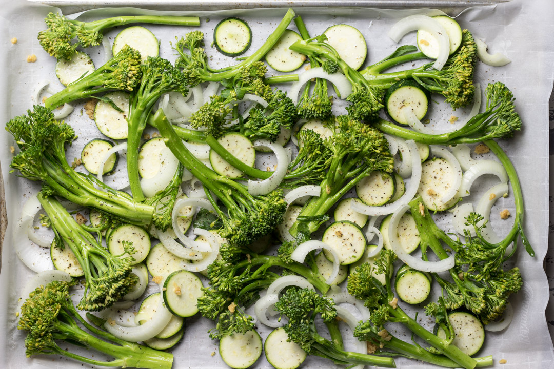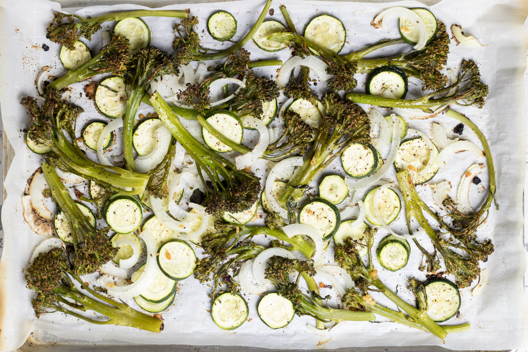 - Place the zucchini, broccolini, onions and garlic on a parchment paper lined baking sheet. Drizzle the veggies with olive oil, sprinkle with salt and pepper, toss to coat the veggies and then roast for 25-30 mins.
