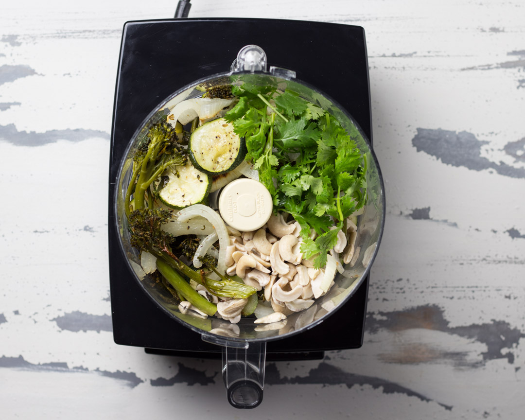 I start by soaking some raw cashews in hot water while I roast the zucchini, broccolini, onions and some garlic at 400F for about 25 mins.