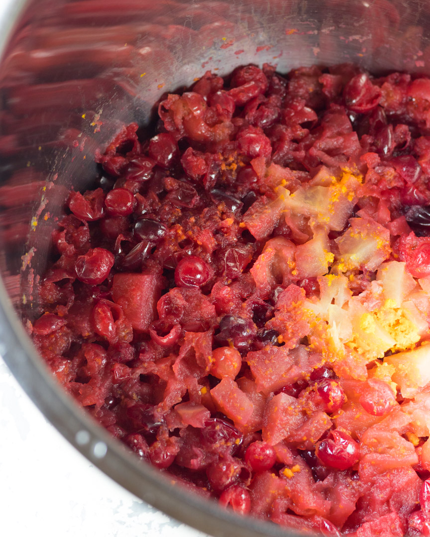 …the zest and juice of one navel orange, one large chopped Gala apple into the Instant Pot.