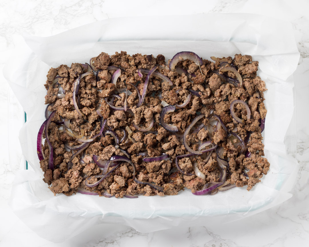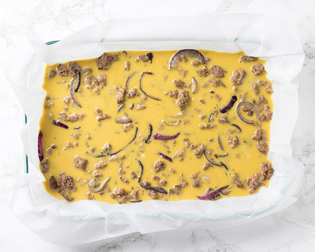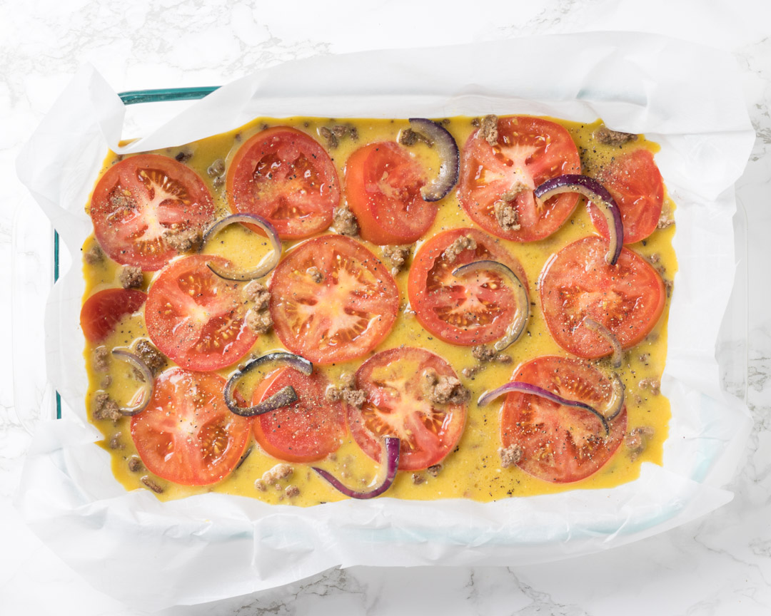 - Into a parchment paper lined 9" x 11" pan, add the cooked beef and onions, then add the egg mixture and then top with the tomato slices.