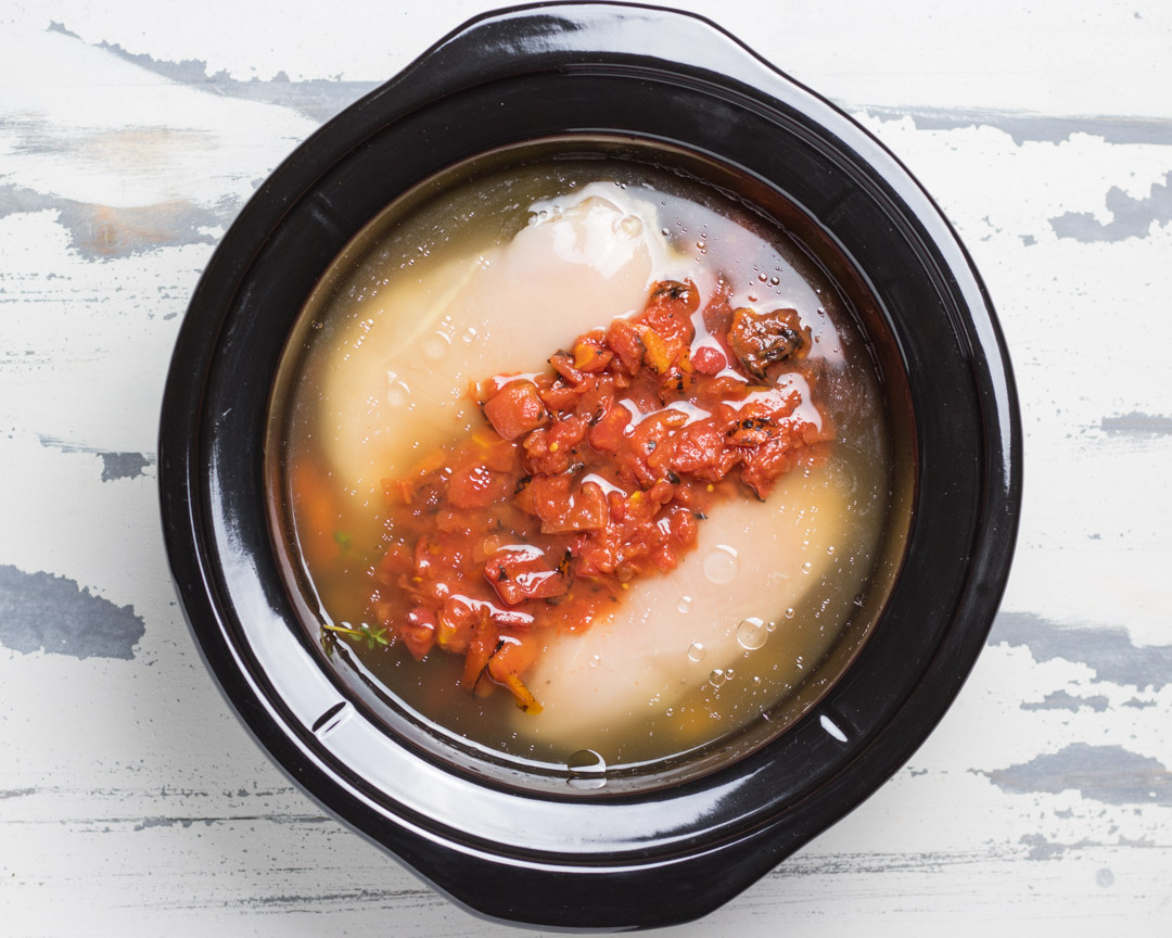 - Remove the chicken, shred the chicken with two forks, place the shredded chicken back into the slow cooker.